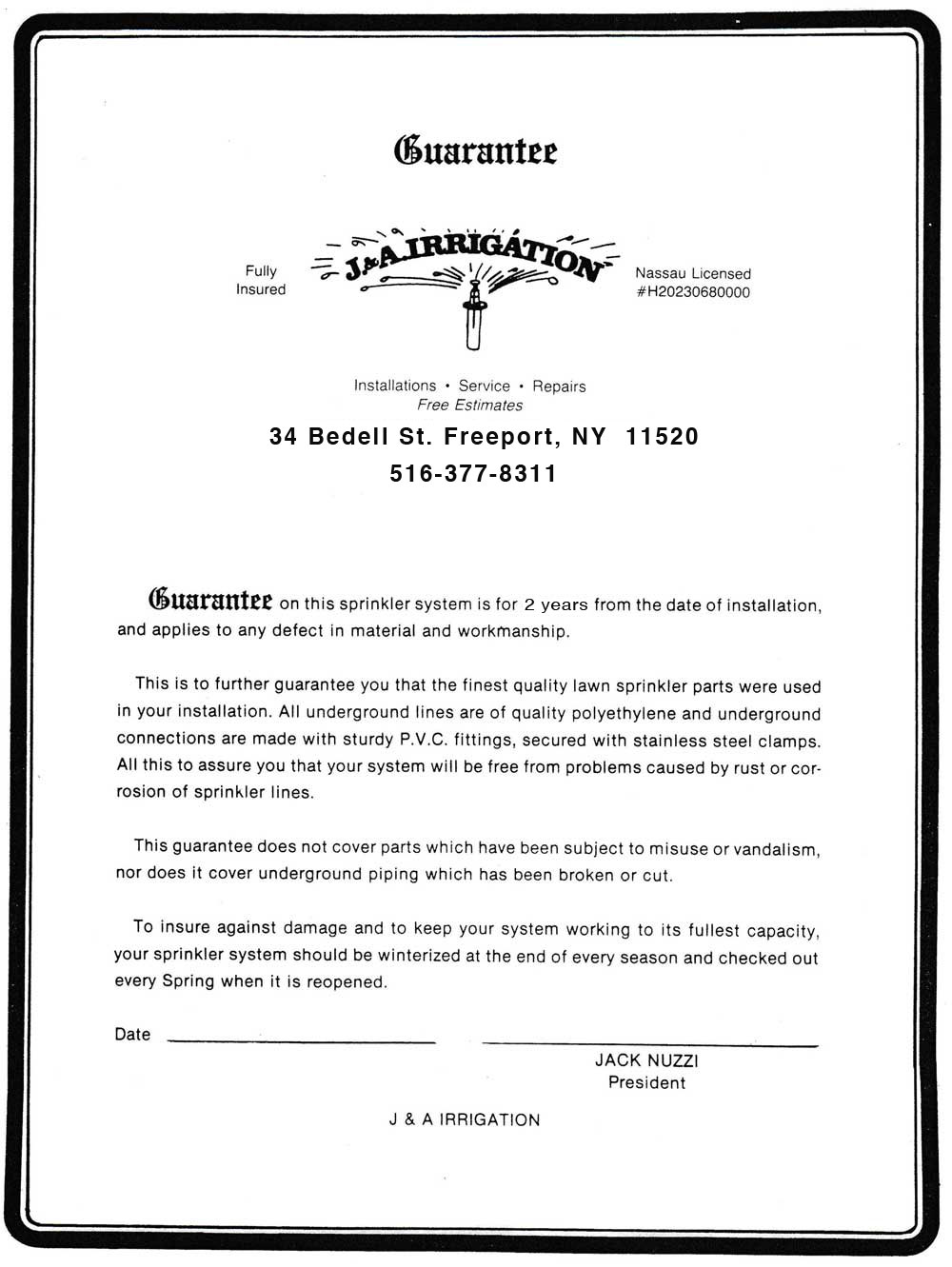 We will beat any written estimate. Our workmanship, experience in the business, and use of the highest quality parts and equipment is the backbone to our business standards. Trust that J & A Irrigation will provide the highest level of service. References available.
